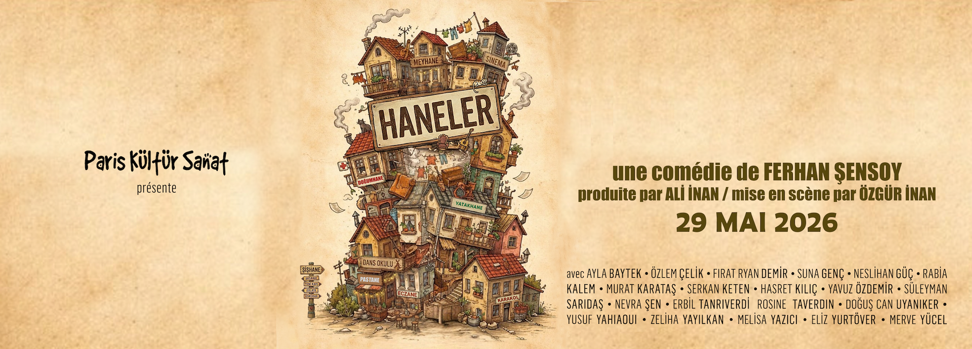 Vendredi 29 mai 2026 à 20h30 Palais des GlacesLe 29 mai 2026, les élèves de l’association Paris Kültür Sanat montent sur la scène du prestigieux Palais des Glaces pour vous présenter Haneler, une comédie satirique du grand dramaturge turcFerhan Şensoy.